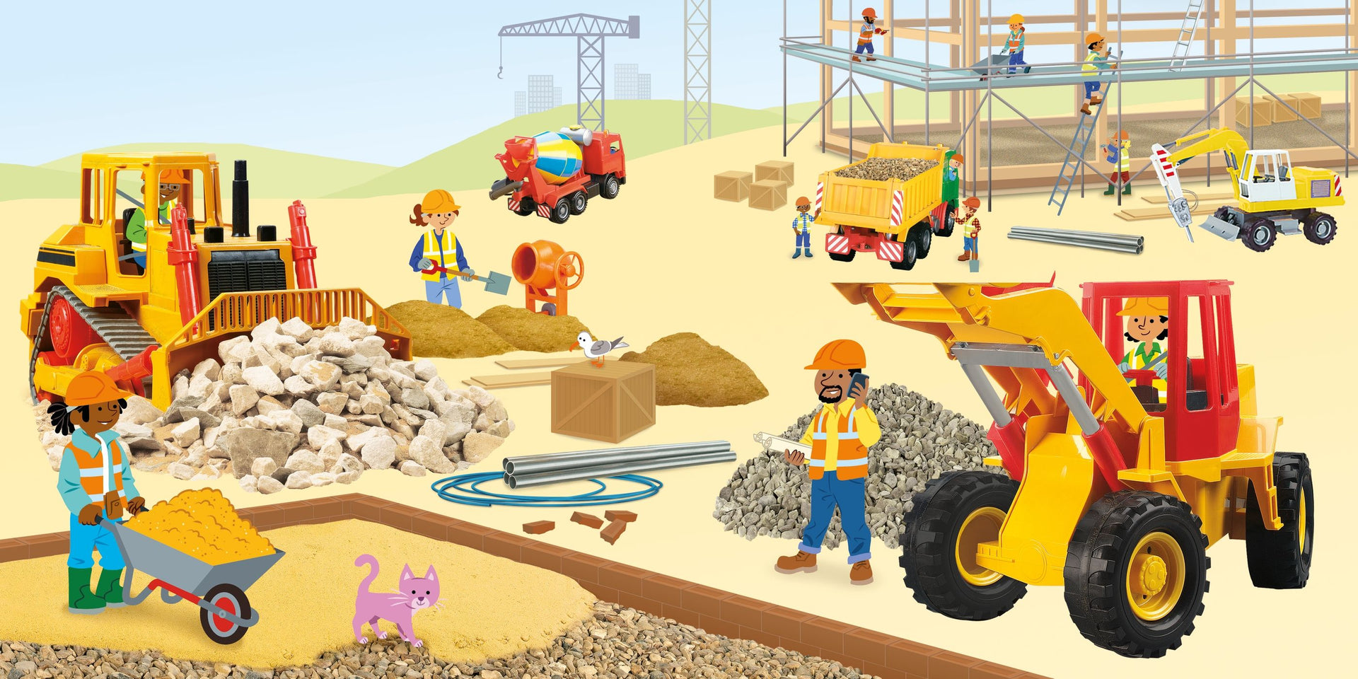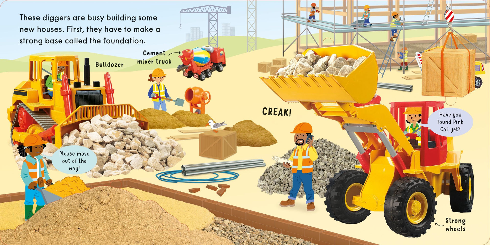 Little hands can lift the big flaps in this robust board book to find out what all the diggers are doing at the building site, on the farm, at the quarry and on the road. On every spread, there's also a pink cat to look for, lots of things to spot and talk about, and a few hidden surprises along the way.