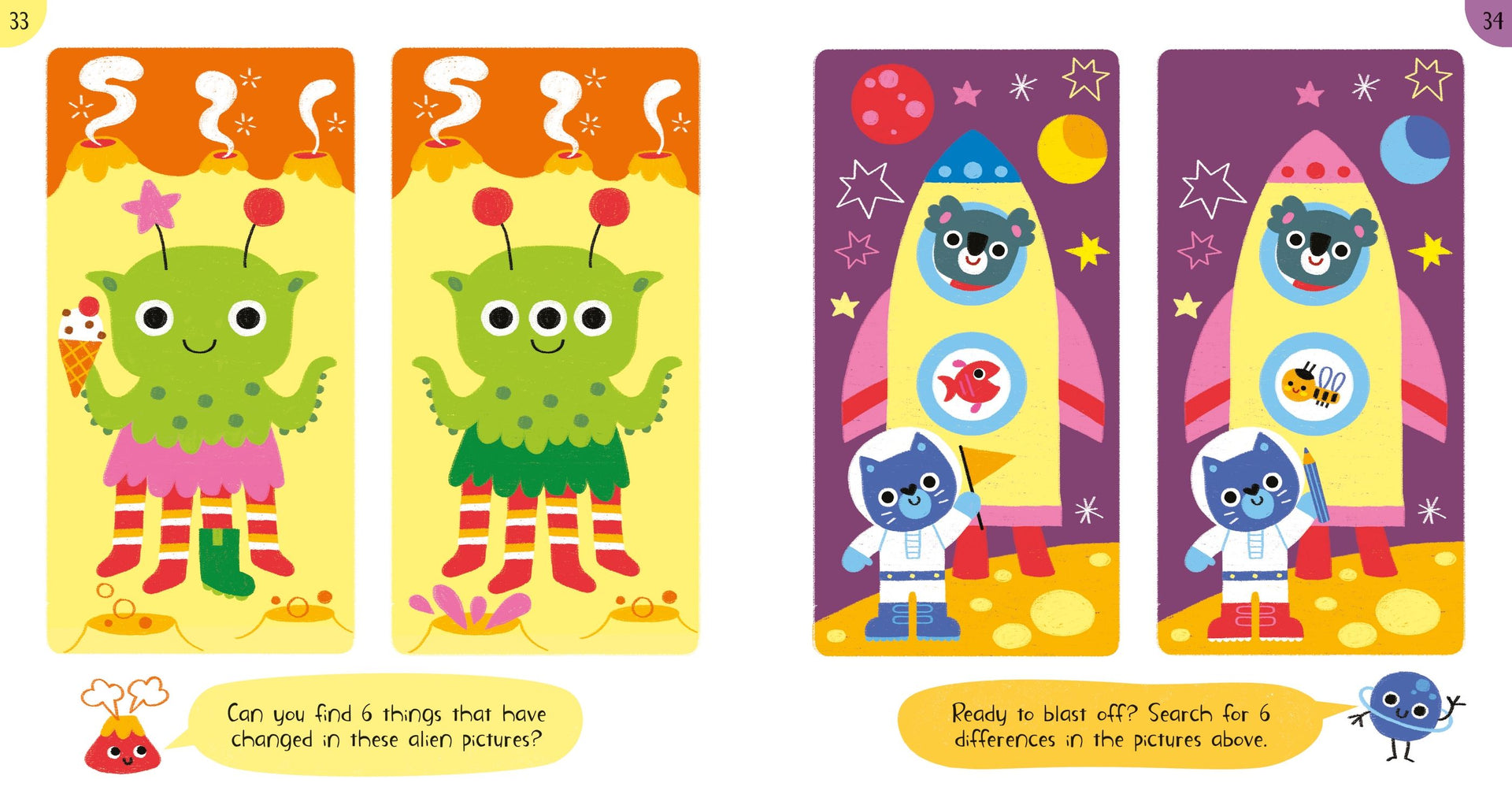This spot-the-difference book will engage little ones for hours as they pore over the puzzles on every page. Delightful illustrations include all kinds of characters, such as pink poodles, ice-skating flamingos, and even astronaut koalas. The differences to spot are both simple and surprising, playing with pattern and shape in ways that young children can easily understand: sandcastles turn into snowmen, hats become crowns and faces become pineapples. Each puzzle takes the reader on an exciting journey, from the bottom of the ocean to the far reaches of outer space - via more familiar settings, like the park or the local pool.