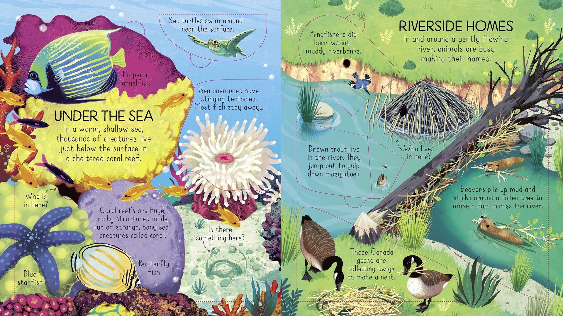 From nests in treetops to dark underground burrows, there are lots of animal homes to discover in this fascinating book. Lift the flaps to see how animals build homes in extreme temperatures, shelter in a warm coral reef, or on a riverbank and lots more. With over 80 flaps to lift and links to websites with videos and pictures of real animal homes.