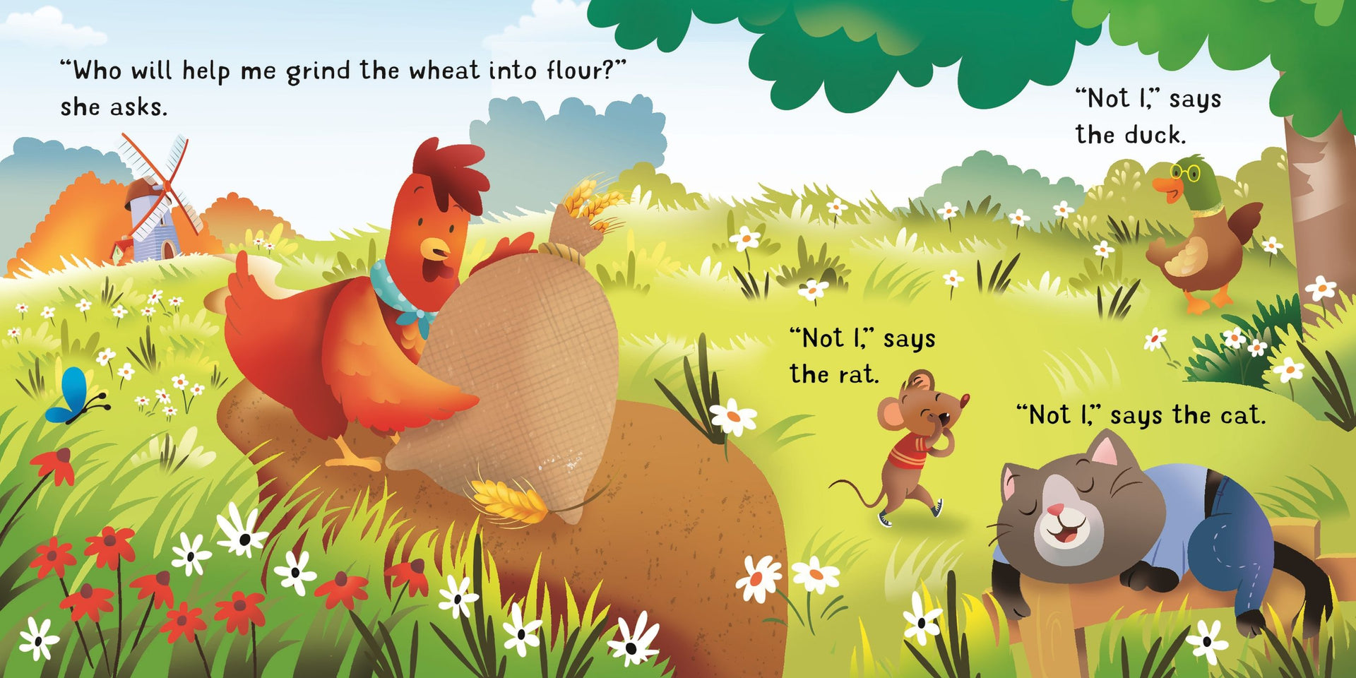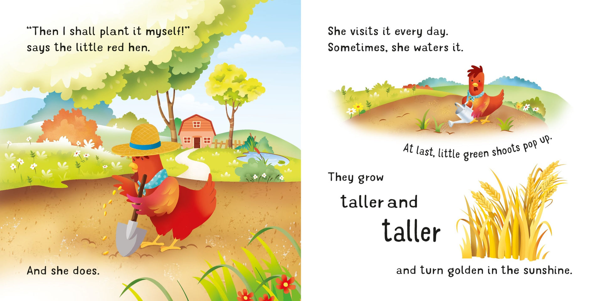 The Little Red Hen has found some grains of wheat, but who will help her plant them? The cat, the rat and the duck are all sitting in the farmyard, enjoying the sun. Surely one of them will join the Little Red Hen as she grows the wheat and mills it. And what happens when she bakes a crusty golden loaf with the flour she has made? A charming retelling of this much-loved tale, incidentally showing the stages from wheat to freshly-baked bread, with delightful illustrations throughout by Raffaella Ligi.