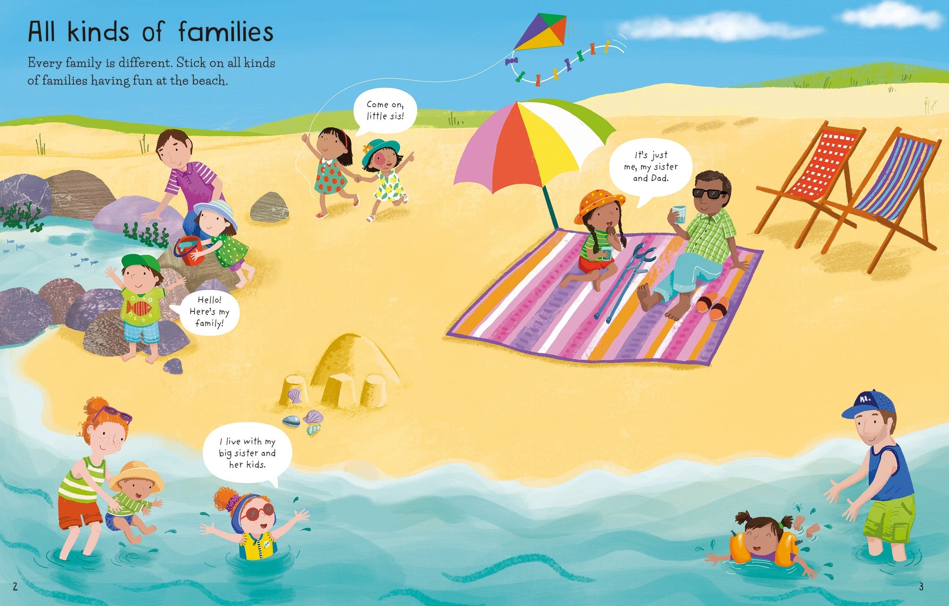 First Sticker Book Families este o carte de stickere( autocolante) ilustrat? care introduce copiii în diverse structuri ?i activit??i ale familiilor, inclusiv modul în care familiile sunt formate, locul în care tr?iesc, modul în care ar putea s?rb?tori ?i ce activit??i ar putea face împreun?.