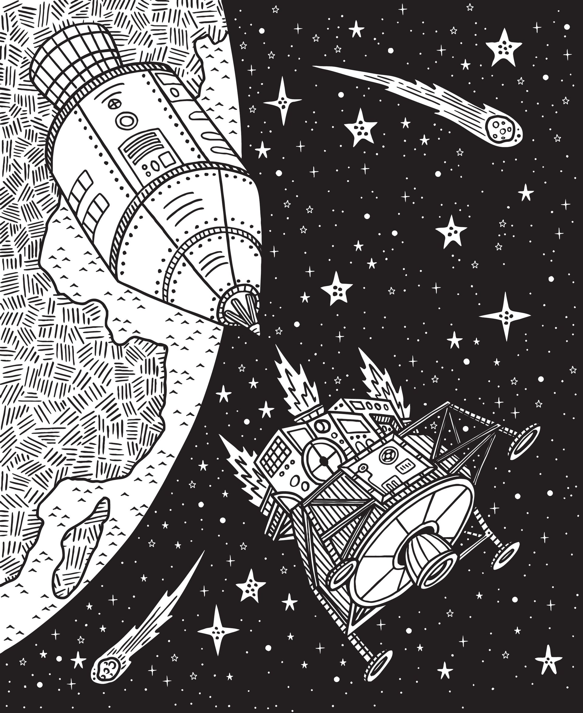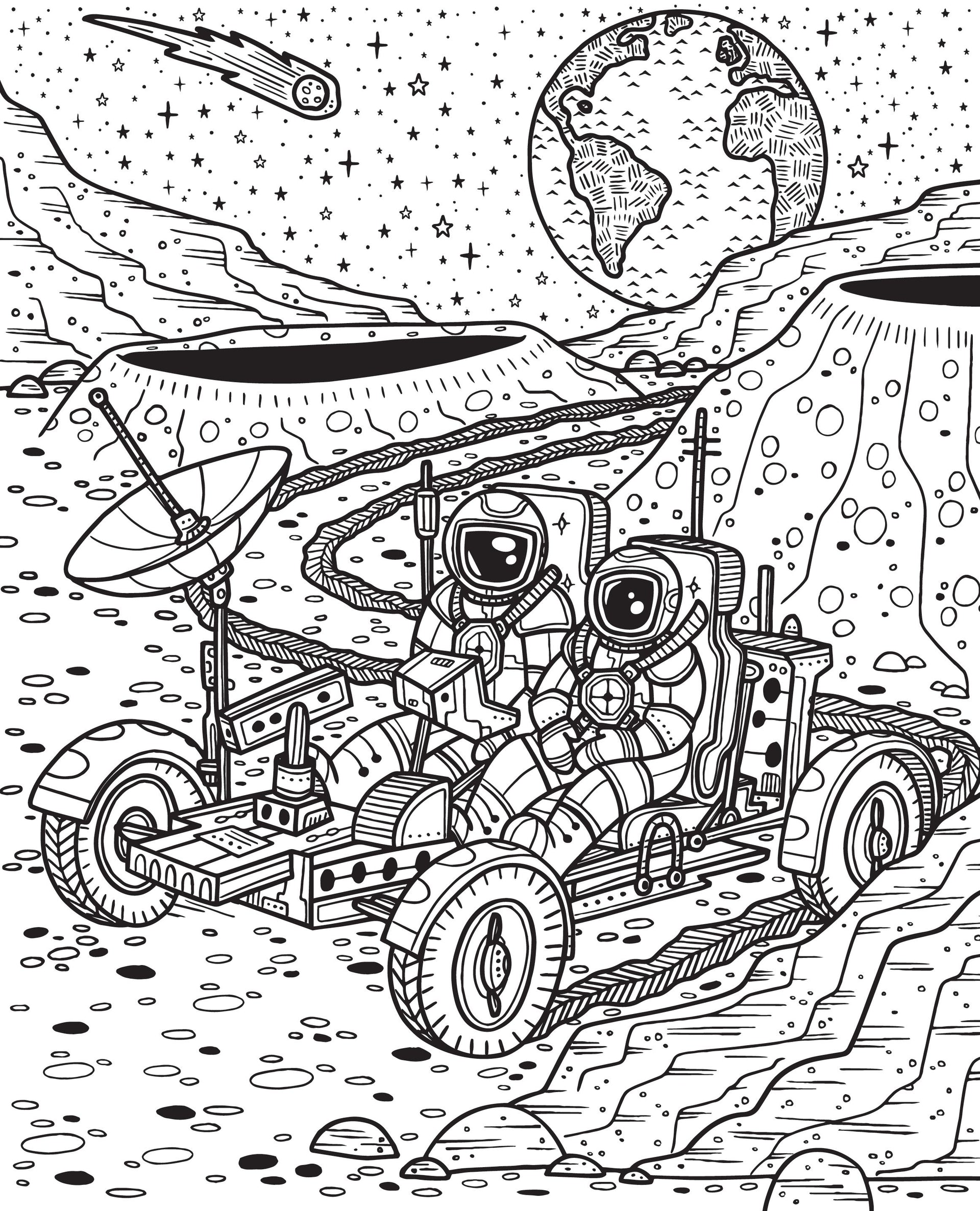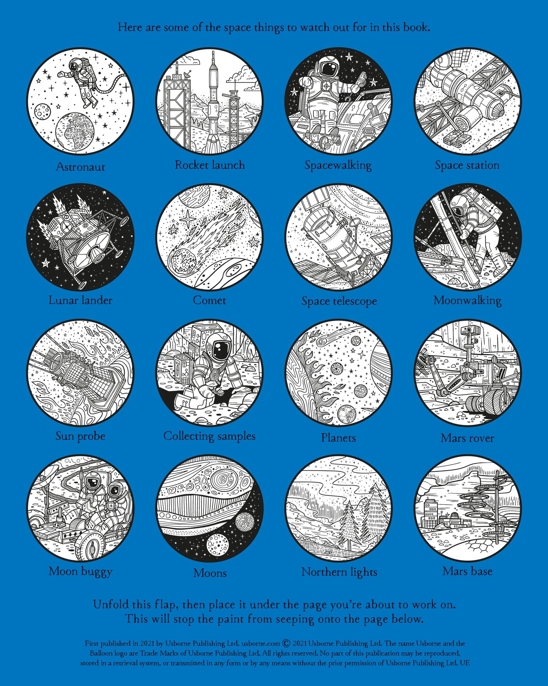 Full of awe-inspiring scenes from space. Simply brush water over the black and white designs to watch everything from asteroids to Sun probes burst into magical colours.