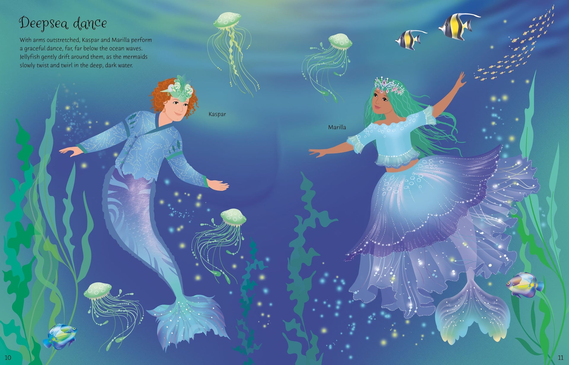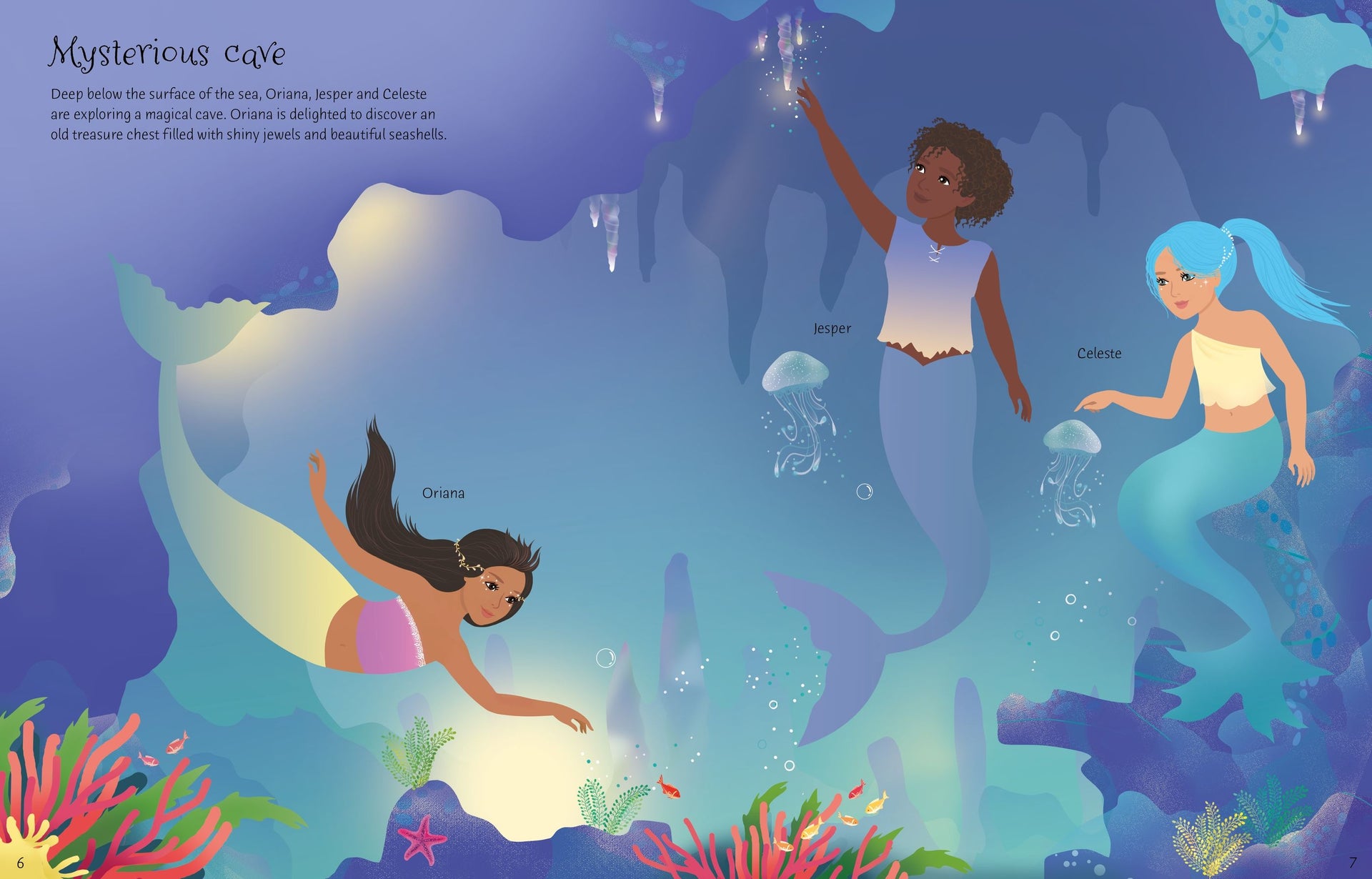 Swim with mermaids as they explore a mysterious cave, find sunken treasure, meet a mer-prince and play with creatures in their mystical underwater world. Add the stickers to dress the mermaids and bring the colourful scenes to life.