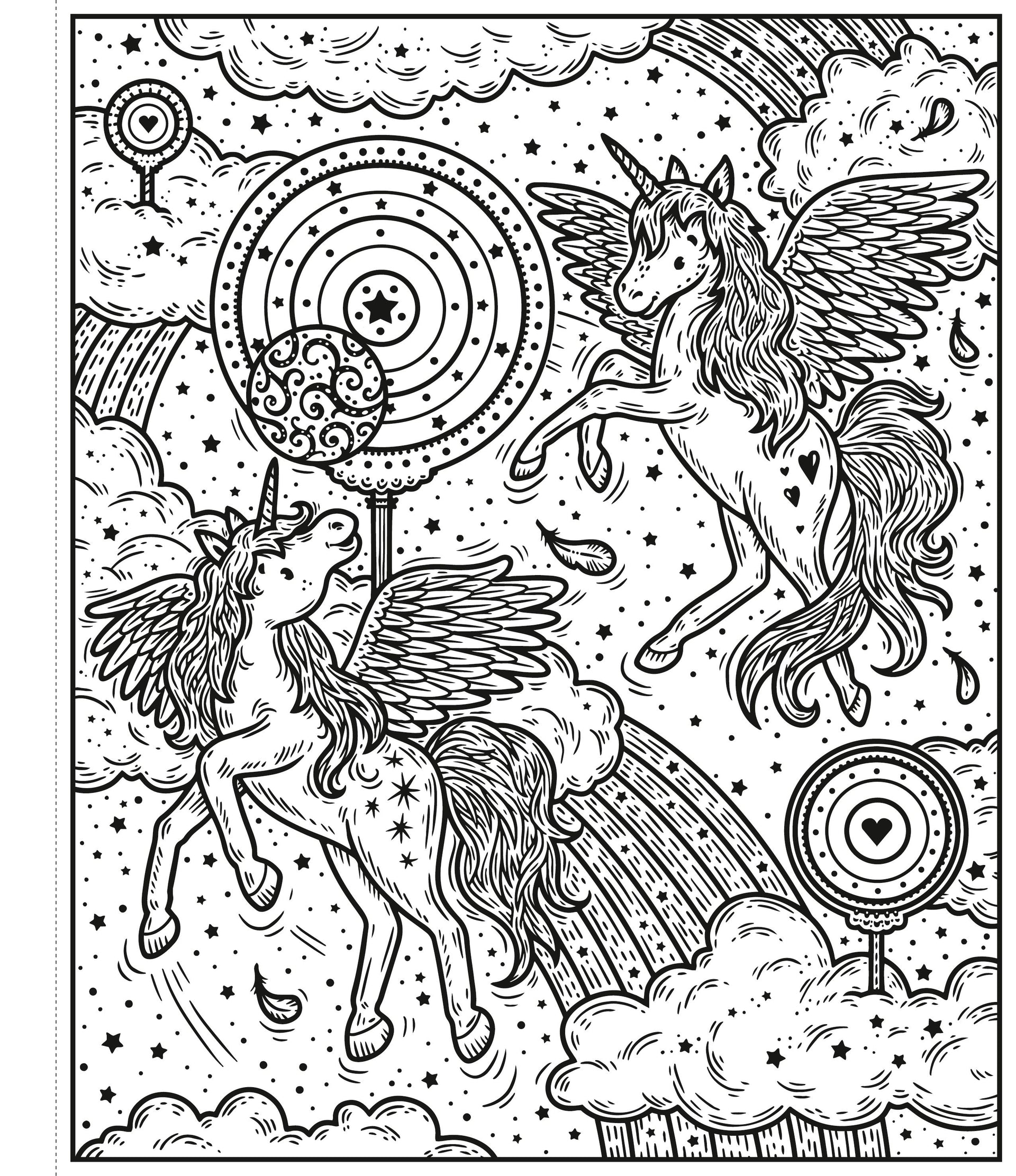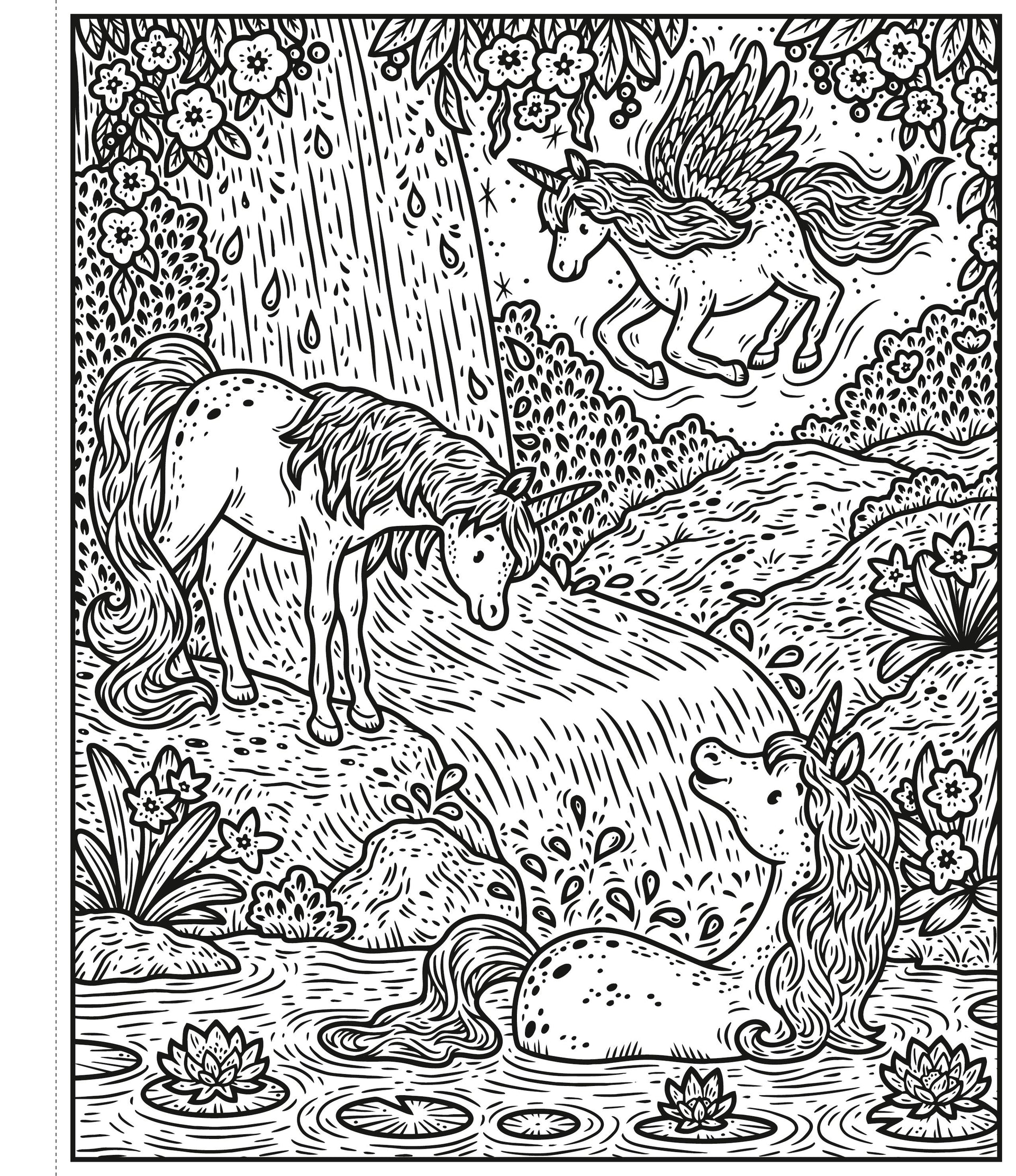 Dezvăluie o lume fermecată plină de unicorni care se joacă alături de zâne, fluturi și sirene printre grădini magice, palate și bazine.