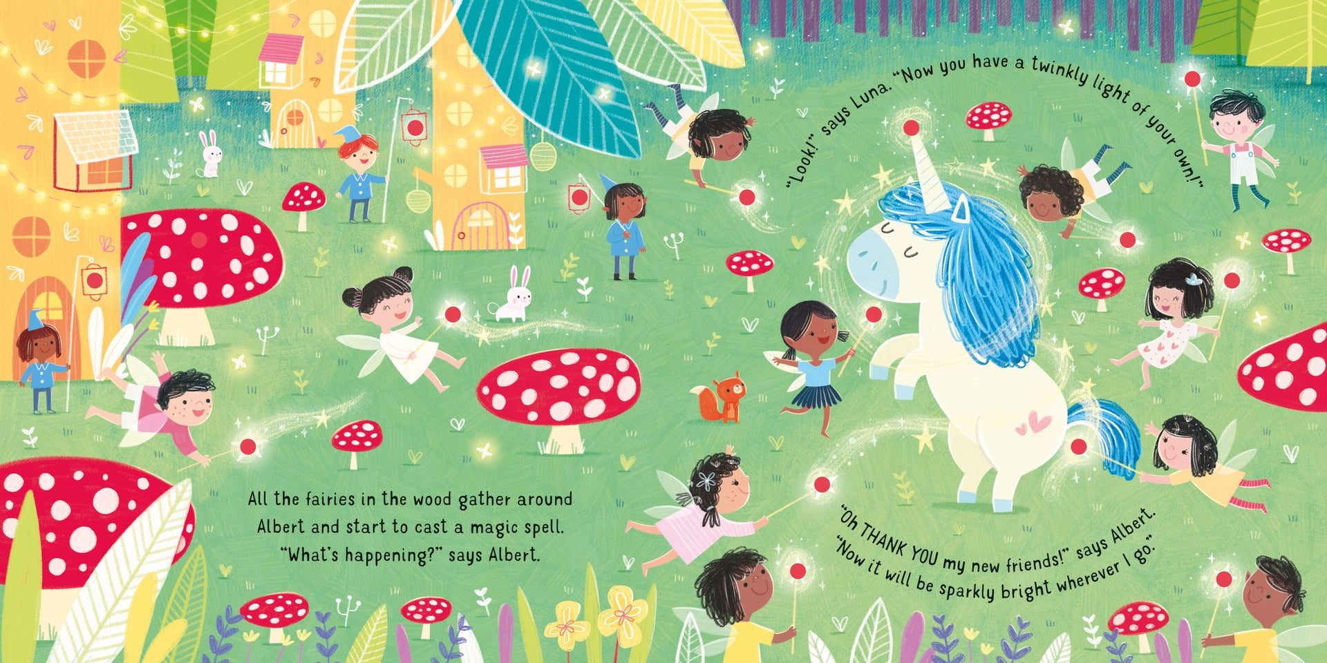 Little children will love seeing the world of fairies sparkle into life with the little lights in this magical novelty book. Albert the unicorn doesn't like the dark, but the fairies light the way for him and help him feel better in a heartwarming story. The number of lights gradually increases as you turn the pages, until you find ten lights at the end.